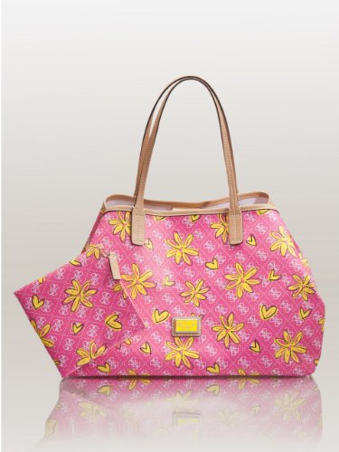 Our classic insignia pattern is splashed with warm-weather color and speckled with flowers and hearts to make an unstructured tote that reflects fun-in-the-sun fashion. ? Faux leather exterior with logo pattern accented with flowers and hearts ? Logo plaque with colored enamel at front ? Interior features an attached pouch with zipper closure ? Magnetic snap closure at top ? Dual top handles with 9 ½" drop ? Fabric lining ? 16 ½"W x 11 ¾"H x 6"D Women's Accessories > Handbags by Collection > Kiss Me - Wink
